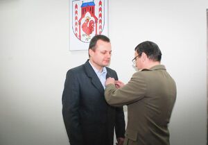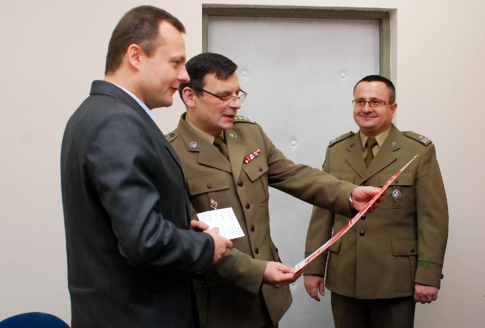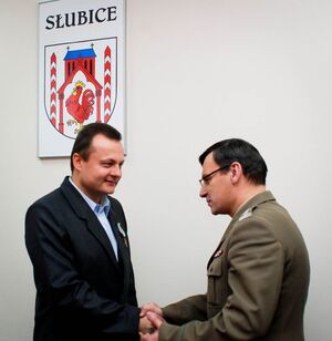 Burmistrz Słubic Pan Tomasz Ciszewicz został odznaczony przez Ministra Spraw Wewnętrznych brązowym Medalem za Zasługi dla Straży Granicznej, który 21 listopada br. w imieniu Ministra wręczył Burmistrzowi Zastępca Komendanta Nadodrzańskiego Oddziału Straży Granicznej płk SG Wiesław Rokicki. Medal ten został przyznany za bardzo dobrą współpracę Miasta Słubice z naszą służbą. Wręczając odznaczenie zastępca Komendanta złożył serdeczne gratulacje wyrażając równocześnie nadzieję na dalszą udaną współpracę. Zastępcy Komendanta NoOSG towarzyszył Komendant Placówki SG w Świecku, jego zastępca oraz Naczelnik Wydziału Prezydialnego. Ponadto podczas wręczania medalu był obecny wiceprezes Zarządu Głównego Związku Emerytów i Rencistów Straży Granicznej ppłk rez. SG Jan Woś.