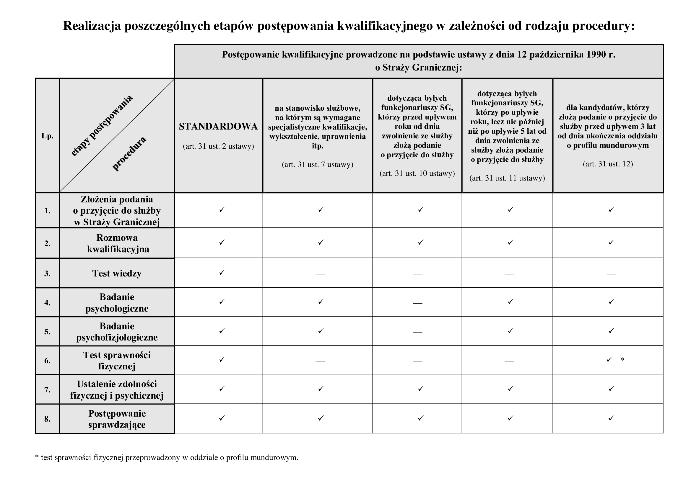 Zgodnie ze znowelizowanym art. 31 ust. 2 ustawy z dnia 12 października 1990 r. o Straży Granicznej postępowanie kwalifikacyjne składa się z następujących etapów: